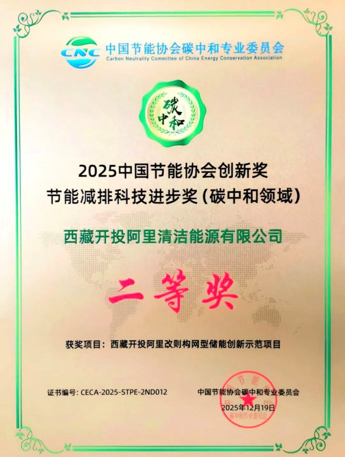 近日,由中國質(zhì)量認(rèn)證中心、中國節(jié)能協(xié)會碳中和專業(yè)委員會聯(lián)合頒發(fā)的2025中國節(jié)能協(xié)會創(chuàng)新獎名單揭曉,由西藏開投阿里清潔能源公司投資建設(shè)的阿里改則構(gòu)網(wǎng)型儲能創(chuàng)新示范項目獲“節(jié)能減排科技進步獎(碳中和領(lǐng)域)二等獎”。