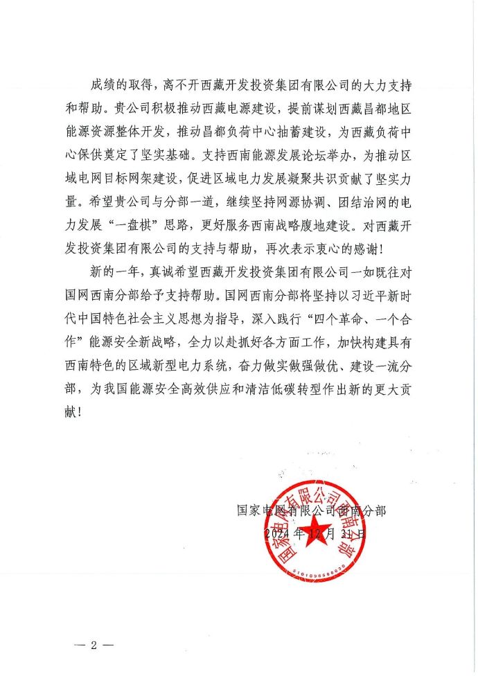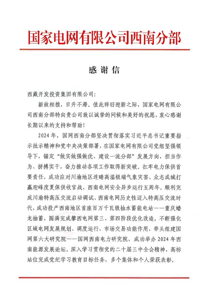 新年伊始,西藏開投集團收到來自國網(wǎng)電力有限公司西南分部的一封感謝信,對集團積極推動西藏電源建設(shè),提前謀劃西藏昌都地區(qū)能源資源整體開發(fā),推動昌都負荷中心抽蓄建設(shè),以及支持西南能源發(fā)展論壇舉辦,推動區(qū)域電網(wǎng)目標網(wǎng)架建設(shè),促進區(qū)域電力發(fā)展凝聚共識作出的貢獻表示感謝。