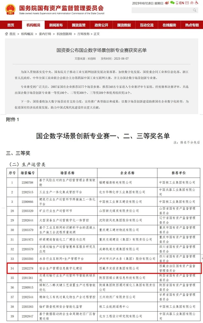 近日,集團公司安全生產(chǎn)管理平臺在國務院國資委首屆國企數(shù)字場景創(chuàng)新專業(yè)賽中榮獲三等獎。