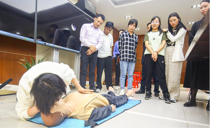 培訓(xùn)過程中,導(dǎo)師通過示范指導(dǎo)、疑問解答、模擬訓(xùn)練等方式,著重演示了海姆立克急救法、心肺復(fù)蘇操作、防震減災(zāi)地震自救以及創(chuàng)傷救護等現(xiàn)場救護操作方法,著重強調(diào)了應(yīng)急救護“黃金四分鐘”及心肺復(fù)蘇胸外按壓的至關(guān)重要性,全體參訓(xùn)人員在導(dǎo)師的指導(dǎo)下對所學(xué)項目進行模擬練習,對不規(guī)范的流程與動作,進行糾正,確保參訓(xùn)人員真正掌握應(yīng)急救護技術(shù)。