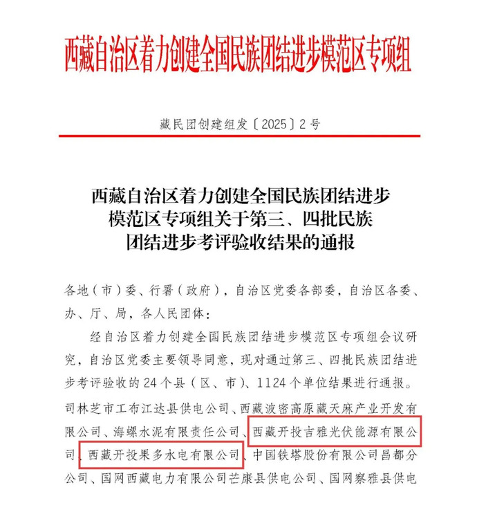 近日,西藏自治區(qū)著力創(chuàng)建全國民族團結(jié)進步模范區(qū)專項組印發(fā)《西藏自治區(qū)著力創(chuàng)建全國民族團結(jié)進步模范區(qū)專項組關(guān)于第三、四批民族團結(jié)進步考評驗收結(jié)果的通報》,西藏開投吉雅光伏公司、果多水電公司位列第四批考評驗收單位名單。