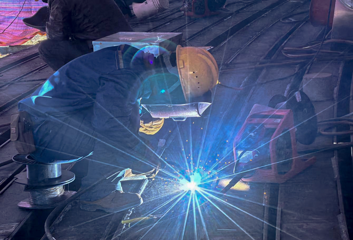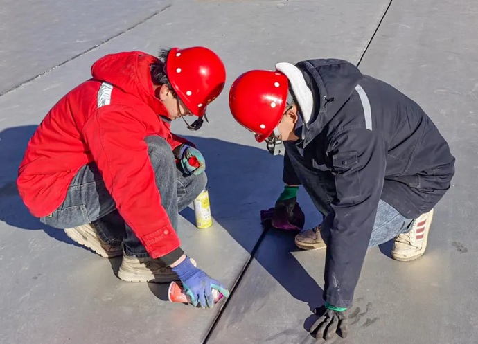 現(xiàn)場(chǎng)工人進(jìn)行金屬板材接縫處理。