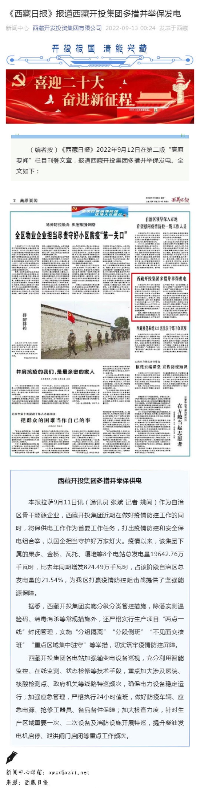 【西藏日?qǐng)?bào)】報(bào)道西藏開投集團(tuán)多措并舉保發(fā)電