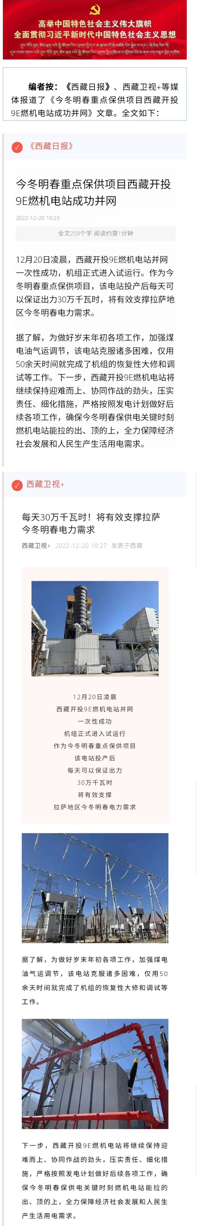 《西藏日?qǐng)?bào)》、西藏衛(wèi)視+報(bào)道今冬明春重點(diǎn)保供項(xiàng)目西藏開投9E燃機(jī)電站成功并網(wǎng)