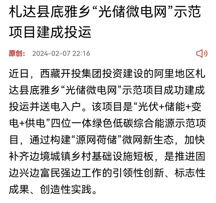 媒體報道丨西藏日報《札達縣底雅鄉(xiāng)“光儲微電網(wǎng)”示范項目建成投運》