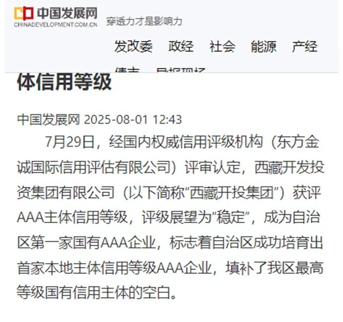 近期,中國(guó)發(fā)展網(wǎng)、西藏日?qǐng)?bào)客戶(hù)端、西藏商報(bào)等媒體聚焦報(bào)道西藏開(kāi)發(fā)投資集團(tuán)有限公司獲評(píng)AAA主體信用等級(jí)消息。7月29日,經(jīng)國(guó)內(nèi)權(quán)威信用評(píng)級(jí)機(jī)構(gòu)(東方金誠(chéng)國(guó)際信用評(píng)估有限公司)評(píng)審認(rèn)定,西藏開(kāi)發(fā)投資集團(tuán)有限公司獲評(píng)AAA主體信用等級(jí),評(píng)級(jí)展望為“穩(wěn)定”,成為自治區(qū)第一家國(guó)有AAA企業(yè),標(biāo)志著自治區(qū)成功培育出首家本地主體信用等級(jí)AAA企業(yè),填補(bǔ)了我區(qū)最高等級(jí)國(guó)有信用主體的空白。
