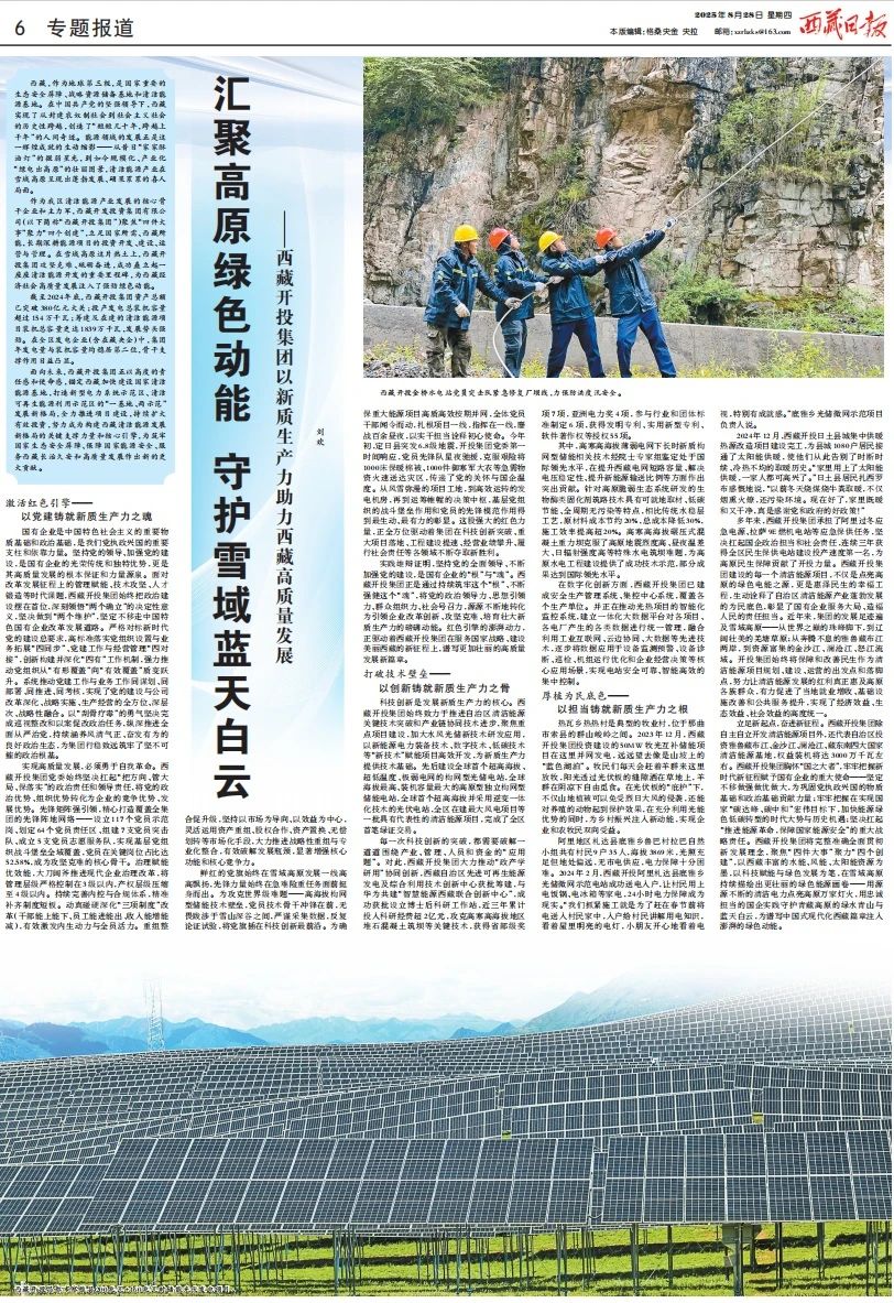 8月28日,《西藏日報》以題為《匯聚高原綠色動能 守護(hù)雪域藍(lán)天白云——西藏開投集團(tuán)以新質(zhì)生產(chǎn)力助力西藏高質(zhì)量發(fā)展》的整版文章,專題報道了西藏開投集團(tuán)近年來致力國企改革、發(fā)展新質(zhì)生產(chǎn)力,推動西藏清潔能源產(chǎn)業(yè)高質(zhì)量發(fā)展的階段性成績。一起來看詳細(xì)報道↓↓↓。