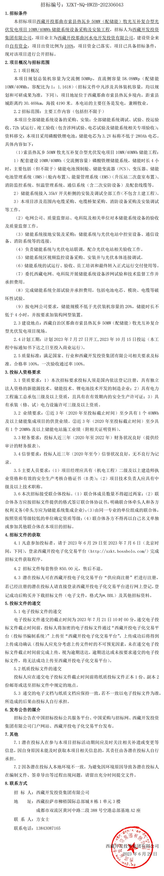 西藏開(kāi)投那曲市索縣熱瓦鄉(xiāng)50MW(配儲(chǔ)能)牧光互補(bǔ)復(fù)合型光伏發(fā)電項(xiàng)目10MW/40MWh儲(chǔ)能系統(tǒng)設(shè)備采購(gòu)及安裝工程招標(biāo)公告