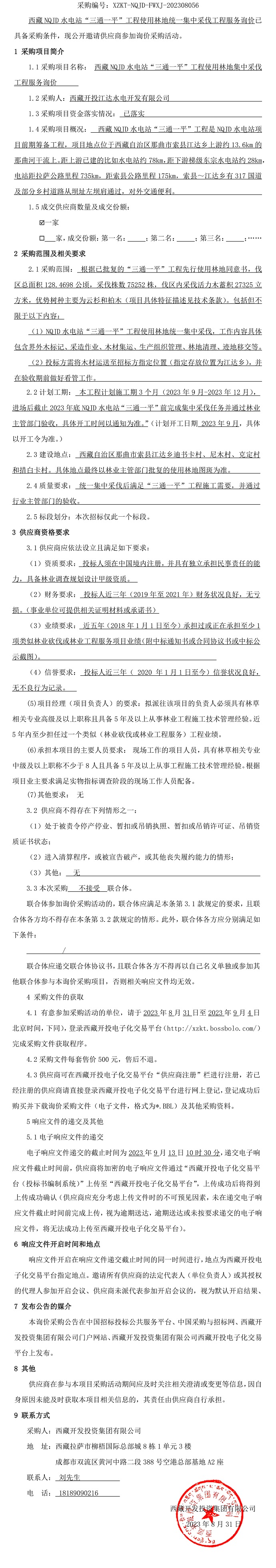 西藏NQJD水電站“三通一平”工程使用林地統(tǒng)一集中采伐工程服務(wù)詢價采購公告