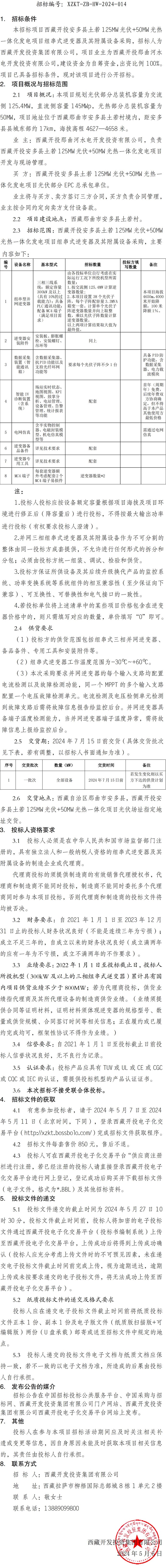 西藏開投安多縣土若 125MW光伏+50MW光熱一體化發(fā)電項目組串式逆變器及其附屬設備采購招標公告
