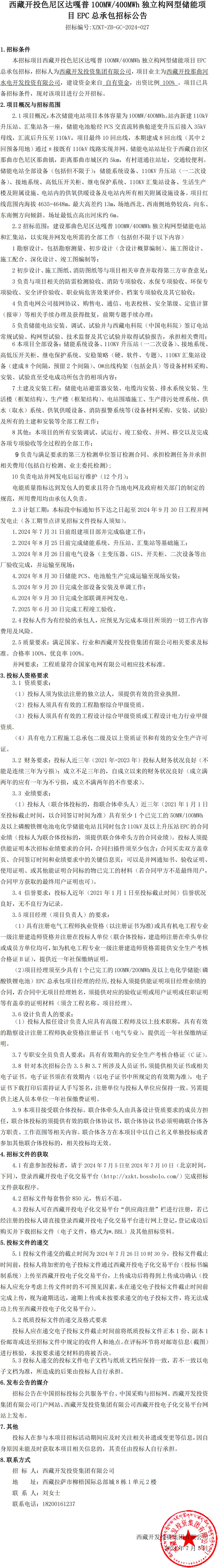 西藏開投色尼區(qū)達嘎普100MW400MWh獨立構網型儲能項目EPC總承包公告