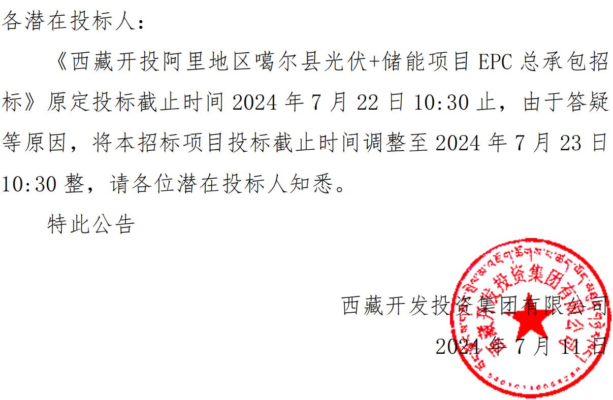 關(guān)于延長《西藏開投阿里地區(qū)噶爾縣光伏+儲(chǔ)能項(xiàng)目EPC總承包招標(biāo)》投標(biāo)截止時(shí)間的公告