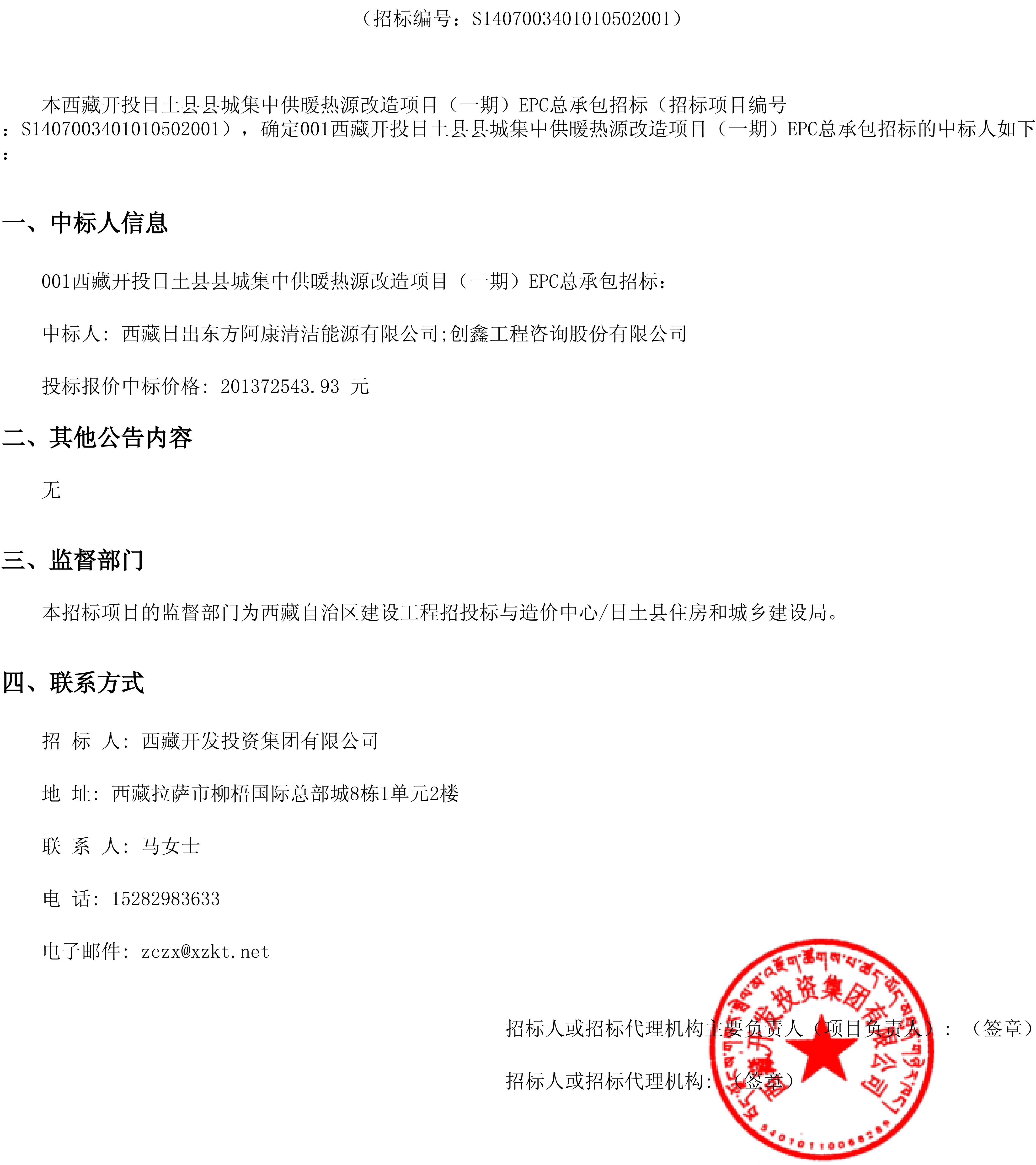 西藏開投日土縣縣城集中供暖熱源改造項目(一期)EPC總承包招標(biāo)項目中標(biāo)結(jié)果公告